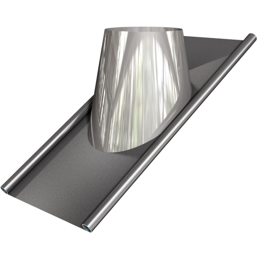 Střešní průchodka 45° (+/-10°) s olověnou základnou. Systém BASIC, NEREZ lesklý plášť, průměr 180mm, tl. vložky 0,5mm, síla izolace 30mm.