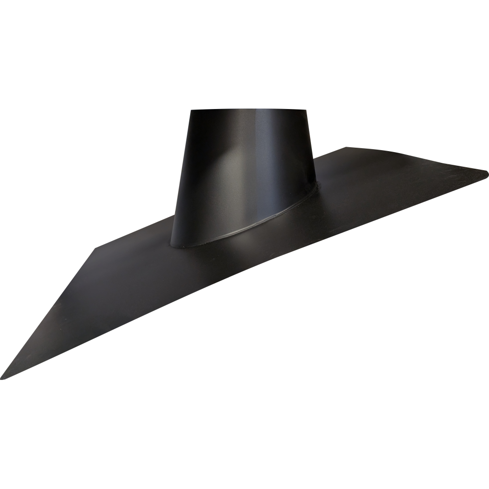 Střešní průchodka 45° (+/-10°) s nerezovou základnou. Systém BASIC NEREZ 9005 s černý lakovaným povrchem (RAL 9005), průměr 180mm, tl. vložky 0,5mm, síla izolace 30mm.